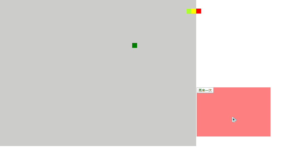 //游戏类型 (function() { //当前作用域的局部变量,存储game的实例 var gameThis = null; //游戏构造函数 function Game() { //将其它三个类型的实例对象存储在game的属性中 //实例化地图对象 this.mapS = new MapS(800, 600, '#ccc'); //实例化食物对象 this.food = new Food(20, 20, 'green'); //实例化蛇 this.snake = new Snake(20, 20,'right'); } //初始化方法 Game.prototype.init = function() { //调用三个类型中的init初始化方法 //调用初始化方法 this.mapS.init(); //调用初始化 this.food.init(); this.snake.init(); } Game.prototype.rule = function() { var divMap = document.getElementById('divMap'); gameThis = this; console.log(gameThis); var timer = setInterval(function(){ gameThis.snake.move(); gameThis.snake.init();// console.log(this); //撞墙死 if(gameThis.snake.snBody[0].x < 0 || gameThis.snake.snBody[0].x >= divMap.offsetWidth/gameThis.snake.width ||(gameThis.snake.snBody[0].y < 0 )|| (gameThis.snake.snBody[0].y >= divMap.offsetHeight/gameThis.snake.height)){ clearInterval(timer); //弹出对话框 var dialogDiv = document.createElement('div'); dialogDiv.style.width = '300px'; dialogDiv.style.height = '200px'; dialogDiv.style.backgroundColor = 'rgba(255,0,0,.5)'; dialogDiv.style.position = 'absolute'; dialogDiv.style.left = '50%'; dialogDiv.style.marginLeft = '-150px'; dialogDiv.style.top = '50%'; dialogDiv.style.marginTop = '-100px'; document.body.appendChild(dialogDiv); var btn = document.createElement('button'); btn.innerText = '再来一次'; dialogDiv.appendChild(btn); btn.onclick = function(){ //window.location浏览器对象下的属性,也是个地址栏对象 //刷新 window.location.reload(); } } //吃食物随机生成新食物,长尾巴 if(gameThis.snake.snBody[0].x == gameThis.food.x && gameThis.snake.snBody[0].y == gameThis.food.y){ //生成新食物 gameThis.food.init(); var arrColor = ['#f40','gold','red','black','blue','purple']; var c = arrColor[parseInt(Math.random()*arrColor.length)]; //长尾巴 var obj = { bgColor:c } gameThis.snake.snBody.push(obj); } },100); } //键盘按下事件 document.onkeydown = function(e){ //console.log(gameThis); switch (e.keyCode){ case 37: gameThis.snake.dir = 'left'; break; case 38: gameThis.snake.dir = 'top'; break; case 39: gameThis.snake.dir = 'right'; break; case 40: gameThis.snake.dir = 'bottom'; break; default: break; } } //公布外界 window.Game = Game; })();最后,调用起来
