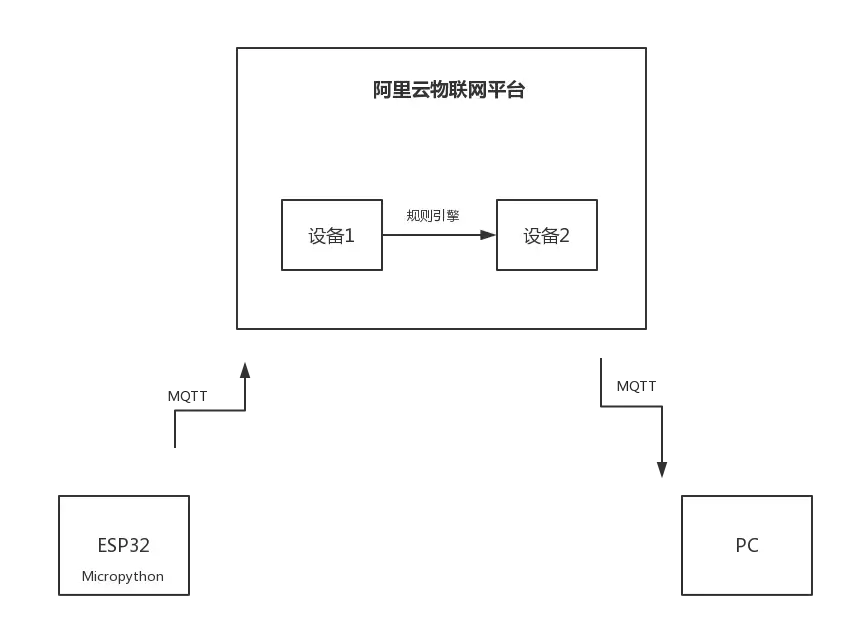 ESP32 通过wifi 接入互联网,使用mqtt协议接入阿里云,将温度数据上传至阿里云。在云端通过消息订阅可以直接查看温度信息。在PC端使用python调用MQTT协议,接入到阿里云。但是PC端和ESP32在阿里云上是两个不同的设备,需要通过阿里云来转发信息,这样PC就可以拿到ESP32上传的数据了。