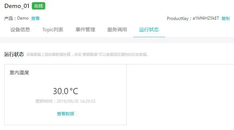 云端和设备端都建立好了之后,可以查看设备运行状态看到数据上传