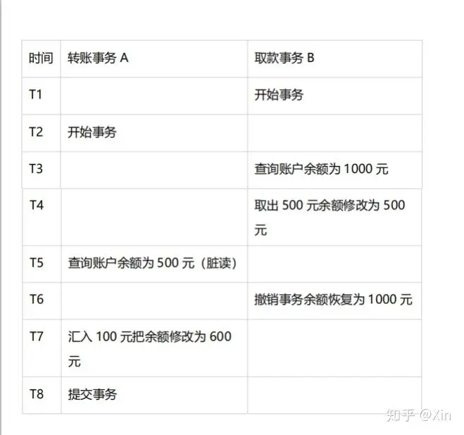 脏读(Dirty Read):A 事务读取 B 事务尚未提交的数据并在此基础上操作,而 B 事务执行回滚,那么 A 读取到的数据就是脏数据。