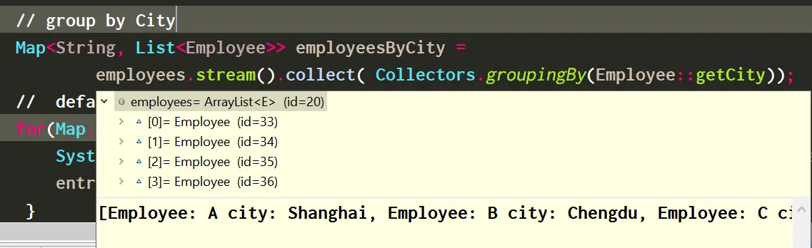 employees.stream().collect( Collectors.groupingBy(Employee::getCity,