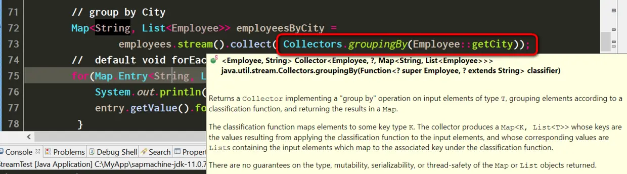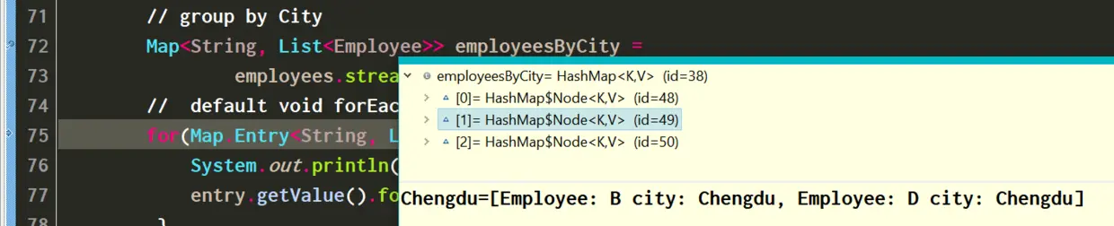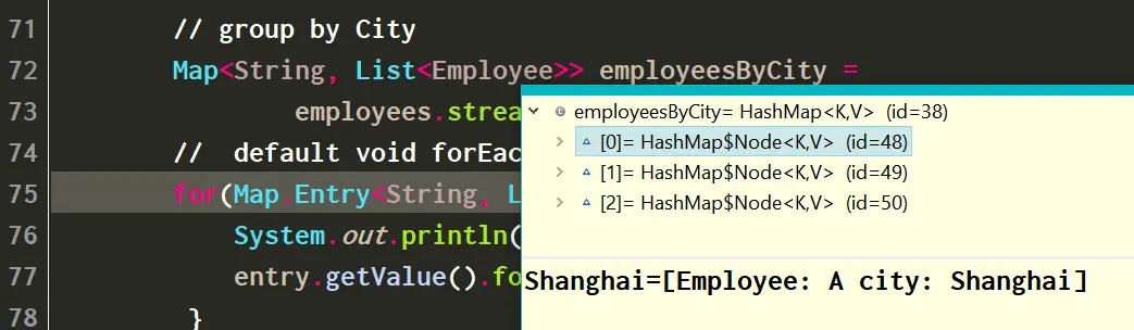 for(Map.Entry<String, List<Employee>> entry:employeesByCity.entrySet()) {