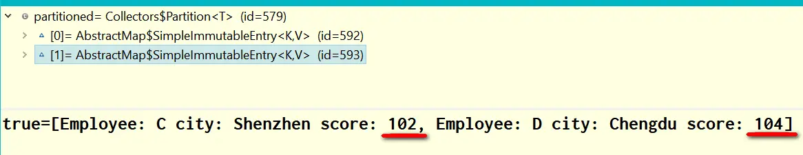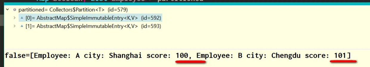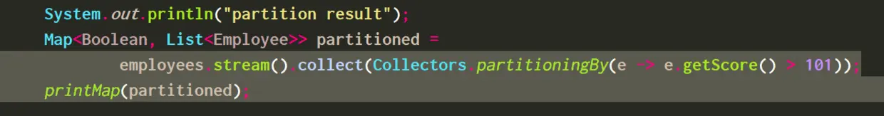 employees.stream().collect(Collectors.partitioningBy(e -> e.getScore() > 101));