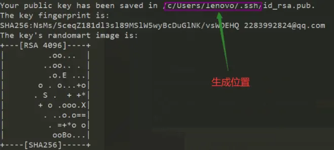 ssh-keygen -t rsa -b 4096 -C 你的邮箱注:运行这句话之后,会按三次回车,看到下图所示的内容即成功生成公钥和私钥;