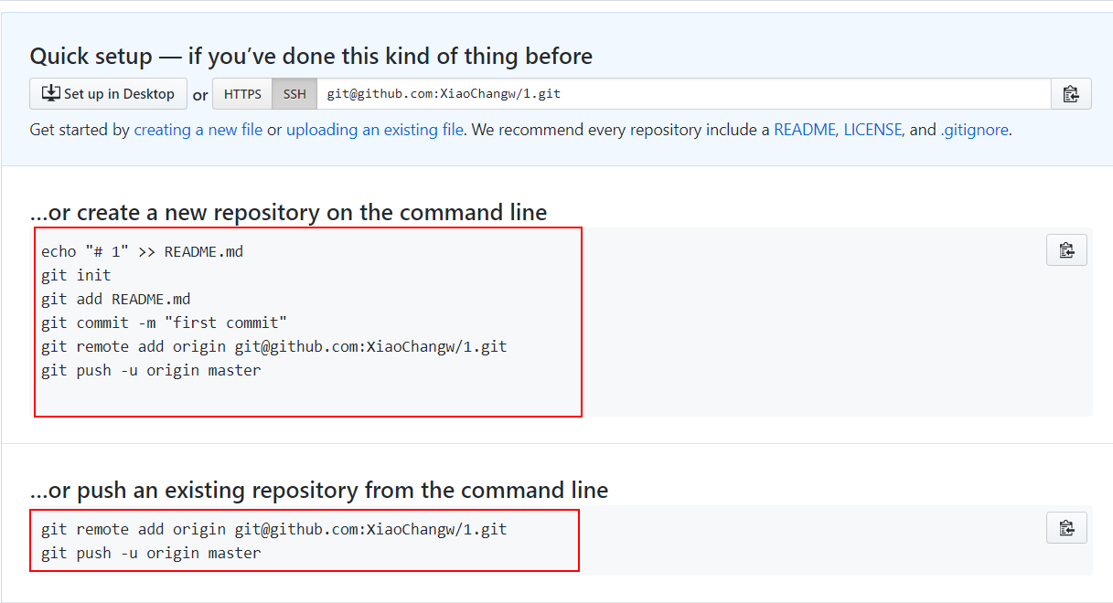 注:上面一部分代码是在你没有本地仓库的状态下执行的,来帮助你创建一个本地仓库;如果已经有本地仓库了,只需要执行下面两行的代码即可; -
