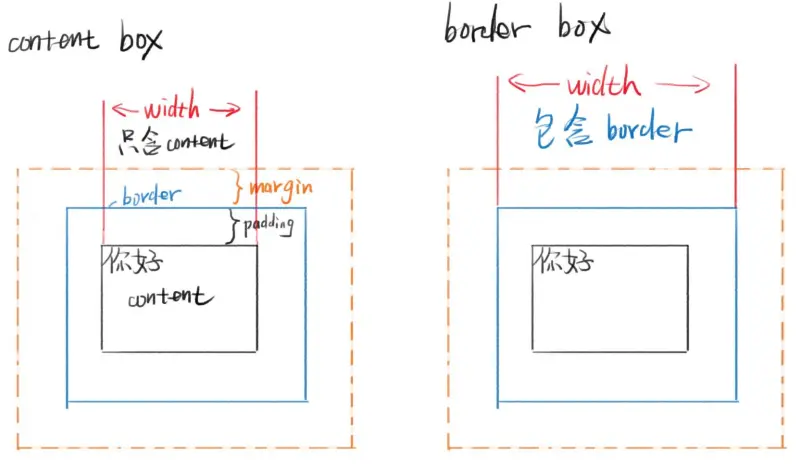 width=border+padding+content的总和,一般看来border box 的使用比较方便。