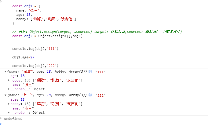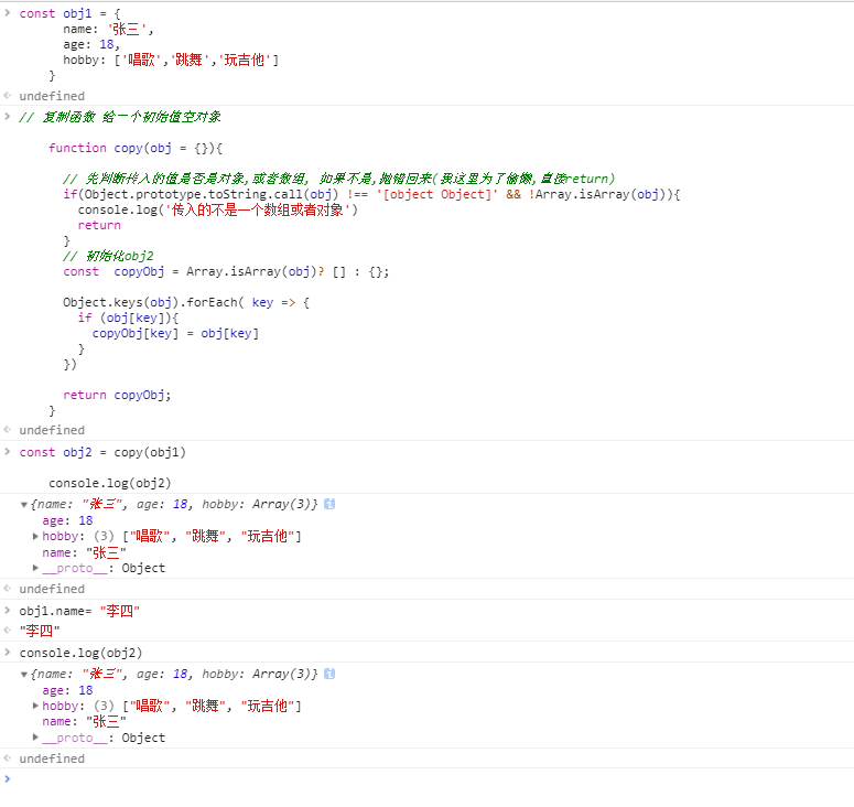 这里就完成了一个相互独立的浅拷贝.注意:这还是浅拷贝.为什么,只复制了一层对象. 上面的代码,我解释一下, 当我们循环赋值时,为什么用了forEach而不是直接for in 或者 for of 如果熟悉ESlint的话,那么会知道,此处用for in 是会报错的. 大概意思就是使用for..in会遍历整个原型链,这样不是很好的实现方法,推荐使用Object.keys. 什么是原型链,后续我们会继续写到.