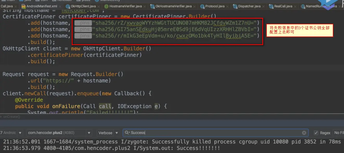 - 防止网站证书被Hack:例如自身网站证书签发A的机构被收买,给别人签了我们网站的证书B.由于B本身是合法的,所以B正常流程下是可以通过证书校验的.而我们App使用CertificatePinner,就可以将我们网站所有证书公钥写死,不再使用本地根证书验证.防止B通过验证.