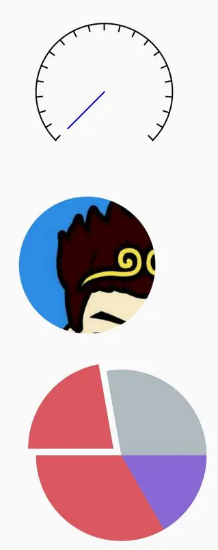 public class DashboardView extends View { private Paint paint; private float angle = 270; private int segments = 20; private float markWidth = 4; private int markLength = 20; private int pointerLength = 150; private float radius = 200; private float lineWidth = 4; private PathDashPathEffect pathDashPathEffect = null; RectF rectF = null; float startAngele = 0F; **** @Override protected void onSizeChanged(int w, int h, int oldw, int oldh) { super.onSizeChanged(w, h, oldw, oldh); float left = getWidth()/2 - radius; float right = getWidth()/2 + radius; float top = getHeight()/2 - radius; float bottom = getHeight()/2 + radius; rectF = new RectF(left,top,right,bottom); startAngele = 90 + (360 - angle) / 2; Path mark = new Path(); mark.addRect(0,0,markWidth,markLength, Path.Direction.CCW); Path arc = new Path(); arc.addArc(rectF,startAngele,angle); //PathMeasure 测量Path长度 PathMeasure pathMeasure = new PathMeasure(arc,false); float arcLength = pathMeasure.getLength(); float advance = (arcLength - markWidth) / segments; pathDashPathEffect = new PathDashPathEffect(mark,advance,0, PathDashPathEffect.Style.ROTATE); } @Override protected void onDraw(Canvas canvas) { super.onDraw(canvas); paint.setColor(Color.BLACK); //绘制仪表盘外围圆弧 canvas.drawArc(rectF,startAngele,angle,false,paint); //设置路径效果 paint.setPathEffect(pathDashPathEffect); //绘制刻度 canvas.drawArc(rectF,startAngele,angle,false,paint); paint.setPathEffect(null); //绘制指针 float centerX = getWidth() / 2; float centerY = getHeight() / 2; float endX = (float) (centerX + pointerLength * Math.cos(Math.toRadians(startAngele))); float endY = (float) (centerY + pointerLength * Math.sin(Math.toRadians(startAngele))); paint.setColor(Color.BLUE); canvas.drawLine(centerX,centerY,endX,endY,paint); } } public class XfermodeView extends View { **** private void init() { //获取Bitmap实例 bitmap = BitmapFactory.decodeResource(getResources(), R.mipmap.img_head); } @Override protected void onDraw(Canvas canvas) { super.onDraw(canvas); float centerX = getWidth() / 2; float centerY = centerX; //离屏缓冲步骤 //1:canvas.saveLayer.将要使用离屏缓冲的范围抠出来 int saveId = canvas.saveLayer(0,0,getWidth(),getHeight(),paint); //2:绘制DST paint.setColor(Color.RED); canvas.drawCircle(centerX,centerY,centerX,paint); //3:setXfermode(指定Mode) paint.setXfermode(new PorterDuffXfermode(PorterDuff.Mode.SRC_IN)); //4:绘制SRC canvas.drawBitmap(bitmap,0,0,paint); //5:setXfermode(null) paint.setXfermode(null); //6:恢复Canvas canvas.restoreToCount(saveId); } } public class PieView extends View { **** private int selectedIndex = 2; private Paint paint = new Paint(Paint.ANTI_ALIAS_FLAG); private float centerX,centerY,radius; private RectF rectF; @Override protected void onSizeChanged(int w, int h, int oldw, int oldh) { super.onSizeChanged(w, h, oldw, oldh); centerX = getWidth() / 2; centerY = getHeight() / 2; radius = Math.min(centerX,centerY) - 50; rectF = new RectF(centerX - radius,centerY-radius,centerX+radius,centerY+radius); paint.setStyle(Paint.Style.FILL); } @Override protected void onDraw(Canvas canvas) { super.onDraw(canvas); //要画几块扇形 int segments = Math.min(colors.length,angles.length); //当前起始角度 float currentAngle = 0F; for(int i = 0; i < segments; i++){ if(i == selectedIndex){ //要'选中'的部分 float angle = currentAngle + angles[i] / 2; float dx = (float) (30 * Math.cos(Math.toRadians(angle))); float dy = (float) (30 * Math.sin(Math.toRadians(angle))); //canvas执行平移 //先save int saveId = canvas.save(); //平移 canvas.translate(dx,dy); //绘制扇形 canvas.drawArc(rectF,currentAngle,angles[i],true,paint); //再restoreToCount canvas.restoreToCount(saveId); currentAngle += angles[i]; }else{ //绘制扇形 paint.setColor(colors[i]); canvas.drawArc(rectF,currentAngle,angles[i],true,paint); currentAngle += angles[i]; } } } } - Canvas.clip***