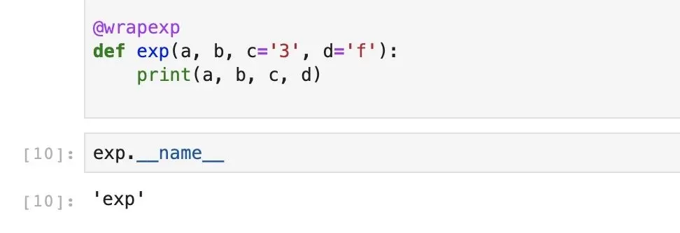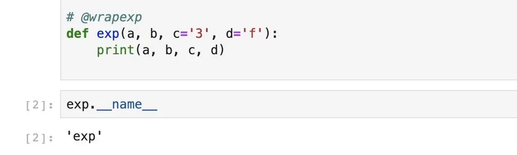 在这个例子当中,我们定义了一个wrapexp的装饰器。我们在其中的wrapper方法当中实现了装饰器的逻辑,wrapexp当中传入的参数func是一个函数,wrapper当中的参数则是func的参数。所以我们在wrapper当中调用func(*args, **kw),就是调用打上了这个注解的函数本身。比如在这个例子当中,我们没有做任何事情,只是在原样调用之前多输出了一行’this is a wrapper',表示我们的装饰器调用成功了。