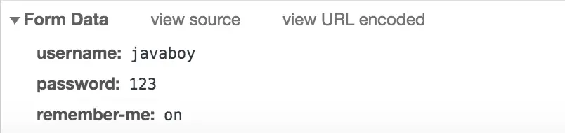 可以看到,登录数据中,除了 username 和 password 之外,还有一个 remember-me,之所以给大家看这个,是想告诉大家,如果你你需要自定义登录页面,RememberMe 这个选项的 key 该怎么写。