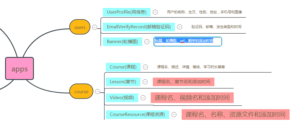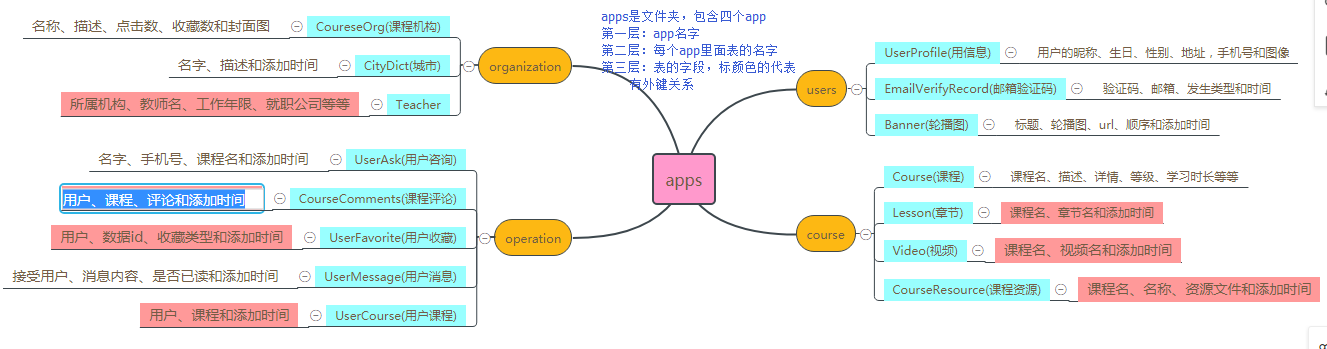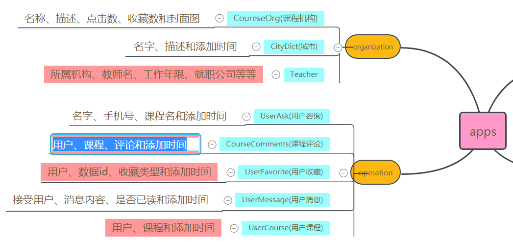 1.2.创建工程 django-admin startproject MxOnline 二、models设计项目的开发都是从models设计开始,后台的管理和前端的渲染无非就是对数据库的增删改查,所以models设计的好坏对整个项目的开发起着至关重要的因素。 下面是我画的图,可以很直观的看出来我们需要的models。