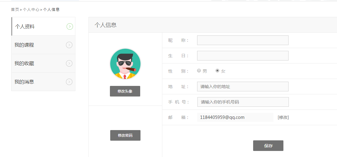 - 个人中心: 修改头像,修改密码,修改邮箱,可以看到我的课程以及我的收藏。可以删除收藏,我的消息。