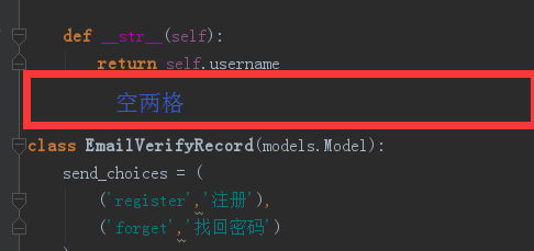 [url=]  [/url] class EmailVerifyRecord(models.Model): send_choices = ( ( ' register ' , ' 注册 ' ), ( ' forget ' , ' 找回密码 ' ) ) code = models.CharField( ' 验证码 ' ,max_length=20) email = models.EmailField( ' 邮箱 ' ,max_length=50) send_type = models.CharField(choices=send_choices,max_length=10) send_time = models.DateTimeField(default=datetime.now) class Meta: verbose_name = ' 邮箱验证码 ' verbose_name_plural = verbose_name [url=]  [/url]