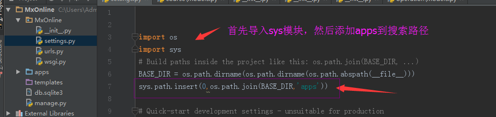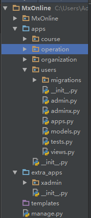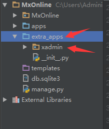 3.2.xadmin的设置 (1)新建Python Package "extra_apps",把源码xadmin文件夹放到extra_apps文件夹下面,此时目录结构如下: (2)把extra_apps右键mark为Source Root并在settings中加入 sys.path.insert(0,os.path.join(BASE_DIR, ' extra_apps ' ))