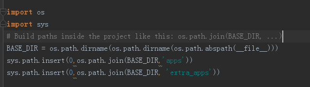 2.5.把四个app放到一个文件夹 不要选“Search for references” 去掉searchfor的勾选。拖进去之后会报错,说找不到那些import的模块了。 解决方案:右键Mark为sourceRoot。根目录下找不到的,会去apps下搜索。 但是这时候cmd下还是会报错。需要在settings设置 import os import sys # Build paths inside the project like this: os.path.join(BASE_DIR, ...) BASE_DIR = os.path.dirname(os.path.dirname(os.path.abspath( __file__ )))sys.path.insert(0,os.path.join(BASE_DIR, ' apps ' ))