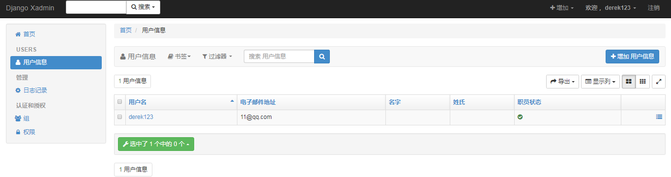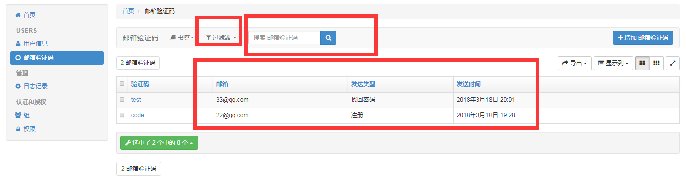 [url=]  [/url] # users/adminx.py import xadmin from .models import EmailVerifyRecord # xadmin中这里是继承object,不再是继承admin class EmailVerifyRecordAdmin(object): # 显示的列 list_display = [ ' code ' , ' email ' , ' send_type ' , ' send_time ' ] # 搜索的字段,不要添加时间搜索 search_fields = [ ' code ' , ' email ' , ' send_type ' ] # 过滤 list_filter = [ ' code ' , ' email ' , ' send_type ' , ' send_time ' ]xadmin.site.register(EmailVerifyRecord,EmailVerifyRecordAdmin) [url=]  [/url]