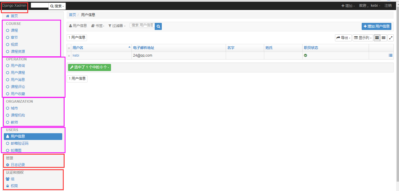 [url=]  [/url] # operation/adminx.py import xadmin from .models import UserAsk, UserCourse, UserMessage, CourseComments, UserFavorite class UserAskAdmin(object): ''' 用户表单我要学习 ''' list_display = [ ' name ' , ' mobile ' , ' course_name ' , ' add_time ' ] search_fields = [ ' name ' , ' mobile ' , ' course_name ' ] list_filter = [ ' name ' , ' mobile ' , ' course_name ' , ' add_time ' ] # class UserCourseAdmin(object): ''' 用户课程学习 ''' list_display = [ ' user ' , ' course ' , ' add_time ' ] search_fields = [ ' user ' , ' course ' ] list_filter = [ ' user ' , ' course ' , ' add_time ' ] class UserMessageAdmin(object): ''' 用户消息后台 ''' list_display = [ ' user ' , ' message ' , ' has_read ' , ' add_time ' ] search_fields = [ ' user ' , ' message ' , ' has_read ' ] list_filter = [ ' user ' , ' message ' , ' has_read ' , ' add_time ' ] class CourseCommentsAdmin(object): ''' 用户评论后台 ''' list_display = [ ' user ' , ' course ' , ' comments ' , ' add_time ' ] search_fields = [ ' user ' , ' course ' , ' comments ' ] list_filter = [ ' user ' , ' course ' , ' comments ' , ' add_time ' ] class UserFavoriteAdmin(object): ''' 用户收藏后台 ''' list_display = [ ' user ' , ' fav_id ' , ' fav_type ' , ' add_time ' ] search_fields = [ ' user ' , ' fav_id ' , ' fav_type ' ] list_filter = [ ' user ' , ' fav_id ' , ' fav_type ' , ' add_time ' ] # 将后台管理器与models进行关联注册。 xadmin.site.register(UserAsk, UserAskAdmin)xadmin.site.register(UserCourse, UserCourseAdmin)xadmin.site.register(UserMessage, UserMessageAdmin)xadmin.site.register(CourseComments, CourseCommentsAdmin)xadmin.site.register(UserFavorite, UserFavoriteAdmin) [url=]  [/url]