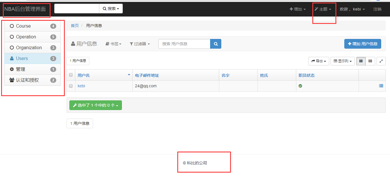 修改django admin 和下面的我的公司收起菜单 [url=]  [/url] # 全局修改,固定写法 class GlobalSettings(object): # 修改title site_title = ' NBA后台管理界面 ' # 修改footer site_footer = ' 科比的公司 ' # 收起菜单 menu_style = ' accordion ' # 将title和footer信息进行注册 xadmin.site.register(views.CommAdminView,GlobalSettings) [url=]  [/url]