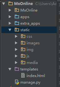四、完成登录功能4.1.首页和登录页面的配置 (1)把html文件中index.html拷贝到templates文件夹内 前端初始文件可以去我github上面下载:https://github.com/derek-zhang123/MxOnline STATICFILES_DIRS = ( os.path.join(BASE_DIR, ' static ' ),)