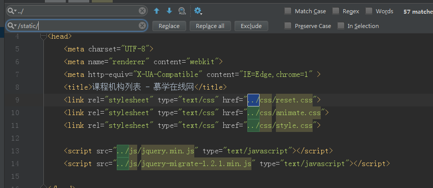 使用ctrl+f查找出所有“../”, 然后ctrl+r 全部替换为“/static/” [url=]  [/url] # MxOnline/urls.py import xadmin from django.urls import path from django.views.generic import TemplateViewurlpatterns = [ path( ' xadmin/ ' , xadmin.site.urls), path( '' , TemplateView.as_view(template_name= ' index.html ' ),name= ' index ' ),] [url=]  [/url]
