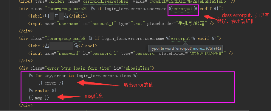 [url=]  [/url] < div class ="form-group marb20 {% if login_form.errors.username %}errorput{% endif %}" > < label > 用 户 名 </ label > < input name ="username" id ="account_l" type ="text" placeholder ="手机号/邮箱" /> </ div > < div class ="form-group marb8 {% if login_form.errors.username %}errorput{% endif %}" > < label > 密 码 </ label > < input name ="password" id ="password_l" type ="password" placeholder ="请输入您的密码" /> </ div > < div class ="error btns login-form-tips" id ="jsLoginTips" > {% for key,error in login_form.errors.items %} {{ error }} {% endfor %} {{ msg }} </ div > [url=]  [/url]