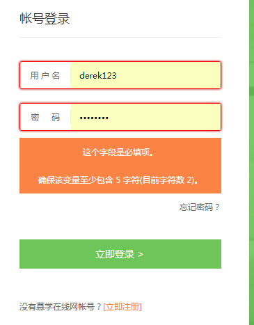显示效果,当不输入用户名,密码小与五位数的时候的提示信息如下: