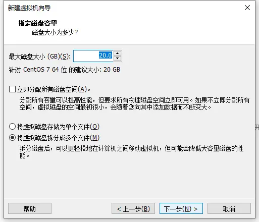- 最大磁盘大小默认,选择将虚拟磁盘拆分为多个文件