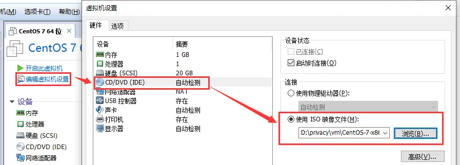 - 选择centos7镜像的存储路径,可以选择中间一项直接选择路径安装,也可以选择第三项稍后安装