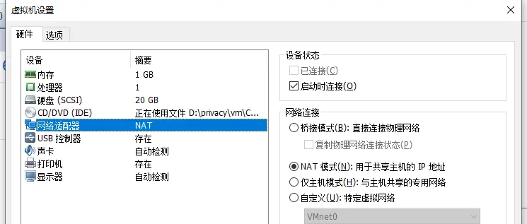- 网络适配器选择NAT模式
