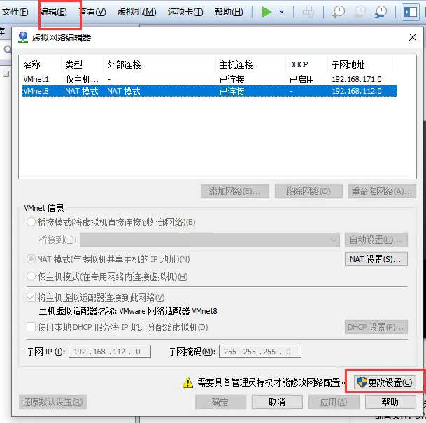 - VmWare,选择编辑->虚拟网络编辑器->更改设置->选择VMnet8