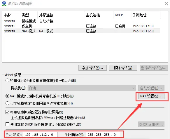 - 配置子网IP,与宿主机VMnet8的配置在同一网段,选择NAT设置