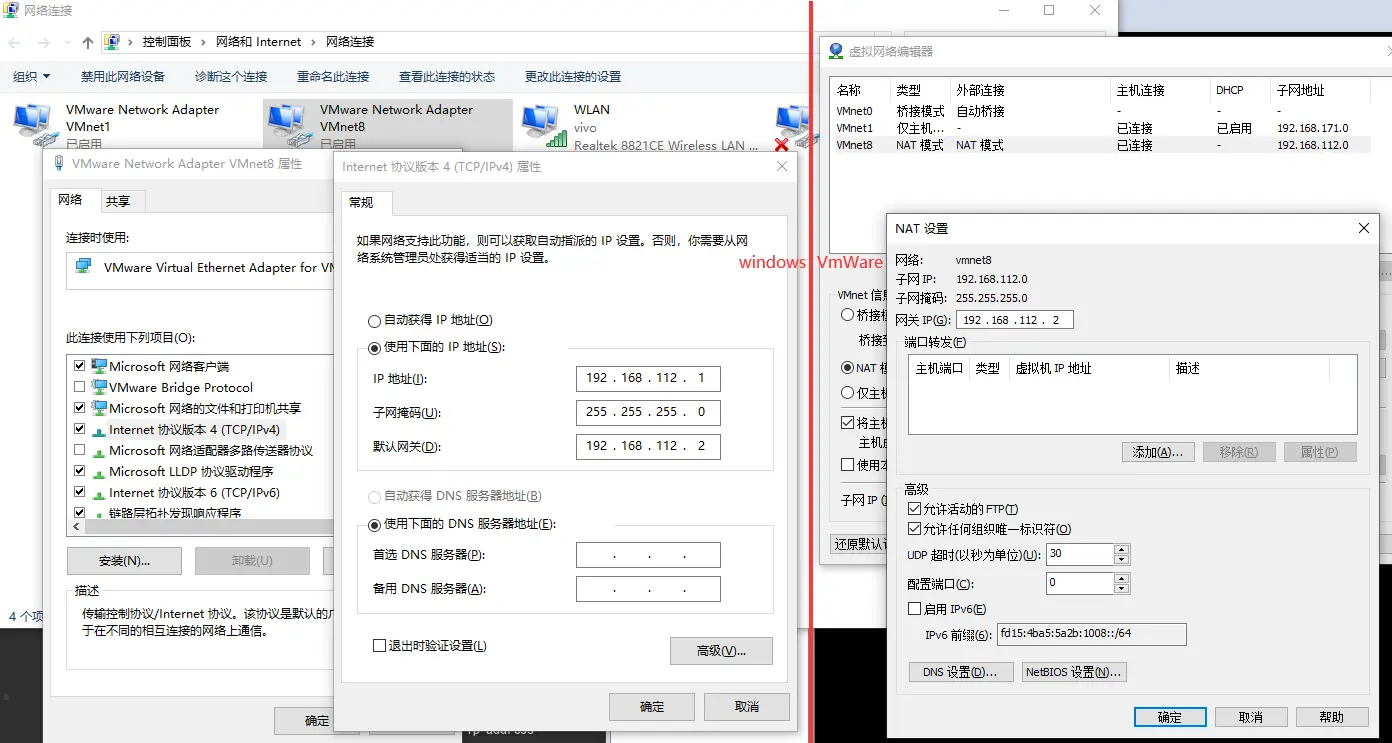 - 选中VMnet8,右击,属性,配置IPv4,后面VmWare的的网络编辑要用到