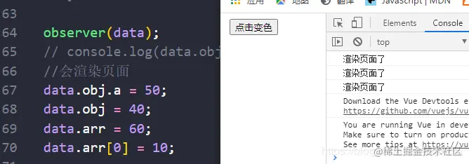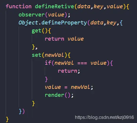 - 2.对Object.defineProperty方法封装,对data对象中的属性监听是否修改,并对它们修改做操作和读取做操作,即 set() 和 get(),设置属性值时,判断是否修改,没修改则不做操作. observer(value):是对data对象属性的属性 例如 a,b 同样进行监听 render():是对数据是否渲染的判断 输出语句