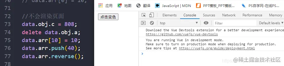 未渲染页面 通过添加属性,删除属性,数组索引的方式是不会得到效果的 前面提过,是不会渲染的 因为Object.defineProperty没有对这些新增和变化的数据监听 数组则是不采用逐个监听的方式,每次变化都需要重新监听太耗费性能,遂采用数组方法来修改数据。 而push 和 reserve 方法则是原生的数组方法,并没有经过Vue内部对其进行修改,所以也达不到效果。
