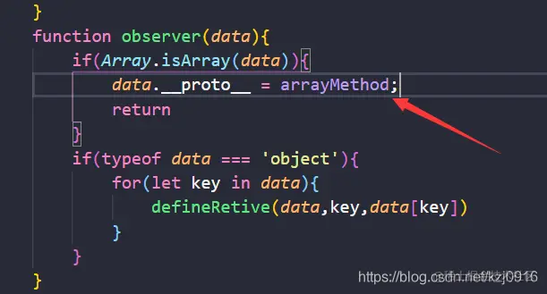 - 第三步是将数组的原型方法指向重写的原型。对应源码src/core/observer/index.js的 49 行。protoAugment方法
