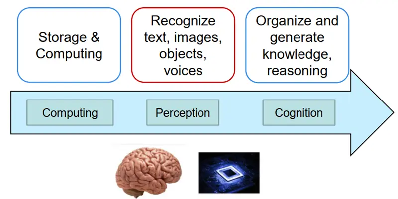 我们再深入分析 AI 近十年的发展,会看到一个重要的标志:人工智能在感知方面取得重要成果。人工智能在语音识别、文本识别、视频识别等方面已经超越了人类,我们可以说 AI 在感知方面已经逐渐接近人类的水平。从未来的趋势来看,人工智能将会有一个从感知到认知逐步发展的基本趋势,如下图所示: