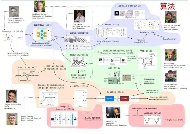 图中最上面浅紫色部分的内容是以前向网络为代表的深度学习算法。第二层淡绿色部分的内容表示一个以自学习、自编码为代表的学习时代。第三层橘色部分的内容代表自循环神经网络(概率图模型的发展)的算法。最下面粉色部分是以增强学习为代表的发展脉络。