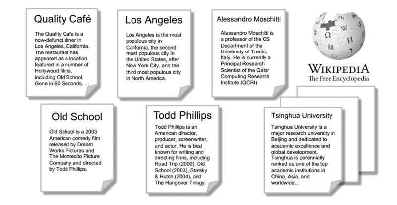 相信很多人对认知图谱都比较陌生,这里我们举一个例子来说明一下。假如我们要解决一个问题“找到一个 2003 年在洛杉矶的 Quality 咖啡馆拍过电影的导演(Who is the director of the 2003 film which has scenes in it filmed at The Quality Cafe in Los Angeles)”。如果是人来解决这个问题的话,可能是先追溯相关的文档,如 Quality 咖啡馆的介绍文档,洛杉矶的维基百科页面等,我们可能会从中找到相关的电影,如 Old School ,在这个电影的介绍文档里面,我们可能会进一步找到该电影的导演 Todd Phillips,经过比对电影的拍摄时间是 2003 年,最终确定答案是 Todd Phillips,具体流程如下图所示: