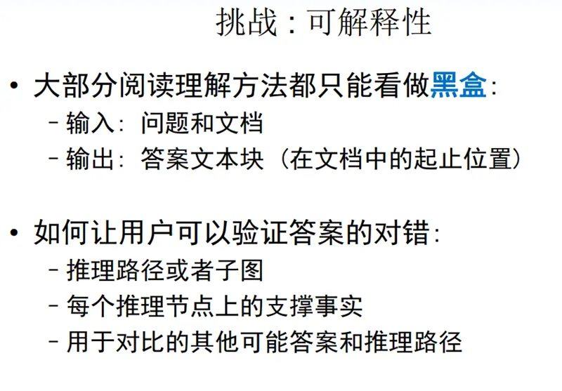 当我们用传统算法(如 BIDAF, BERT, XLNet)进行解决的时候,计算机可能只会找到局部的片段,仍然缺乏一个在知识层面上的推理能力,这是计算机很欠缺的。人在这方面具有优势,而计算机缺乏类似的能力。