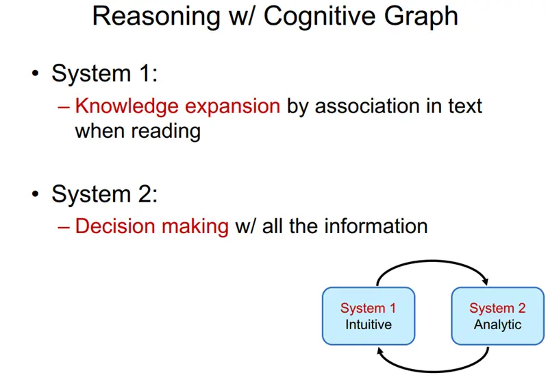 因此,我们大概用这个思路构建了这个新的、我们称为认知图谱的这样一个方法。在 System 1 中我们主要做知识的扩展,在 System 2 中我们做逻辑推理和决策,如下图所示: