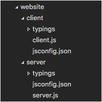 在更复杂的项目中,您可能在工作区中定义了多个 jsconfig.json 文件。 您希望这样做,这样一个项目中的代码就不会被建议作为 IntelliSense 在另一个项目中进行编码。 下面是一个带有客户端和服务器文件夹的项目,展示了两个独立的 JavaScript 项目。