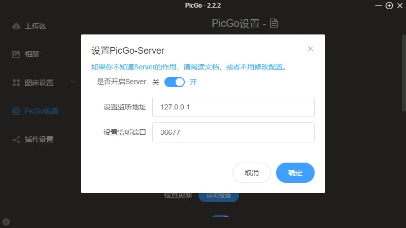 图中可以看出监听地址以及端口号,这个需要与PicGo的Server服务中的监听地址以及端口号一致,否则上传会失败!