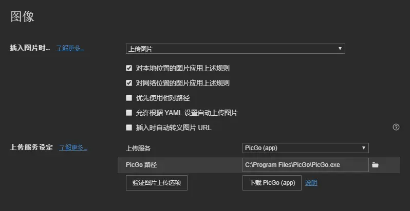 接下来进行Typora的设置,Typora的安装我就不说了,相信大家都会安装,打开typora软件,依次打开步骤为:文件 -> 偏好设置 -> 图像,具体配置参考下面的图中的配置:
