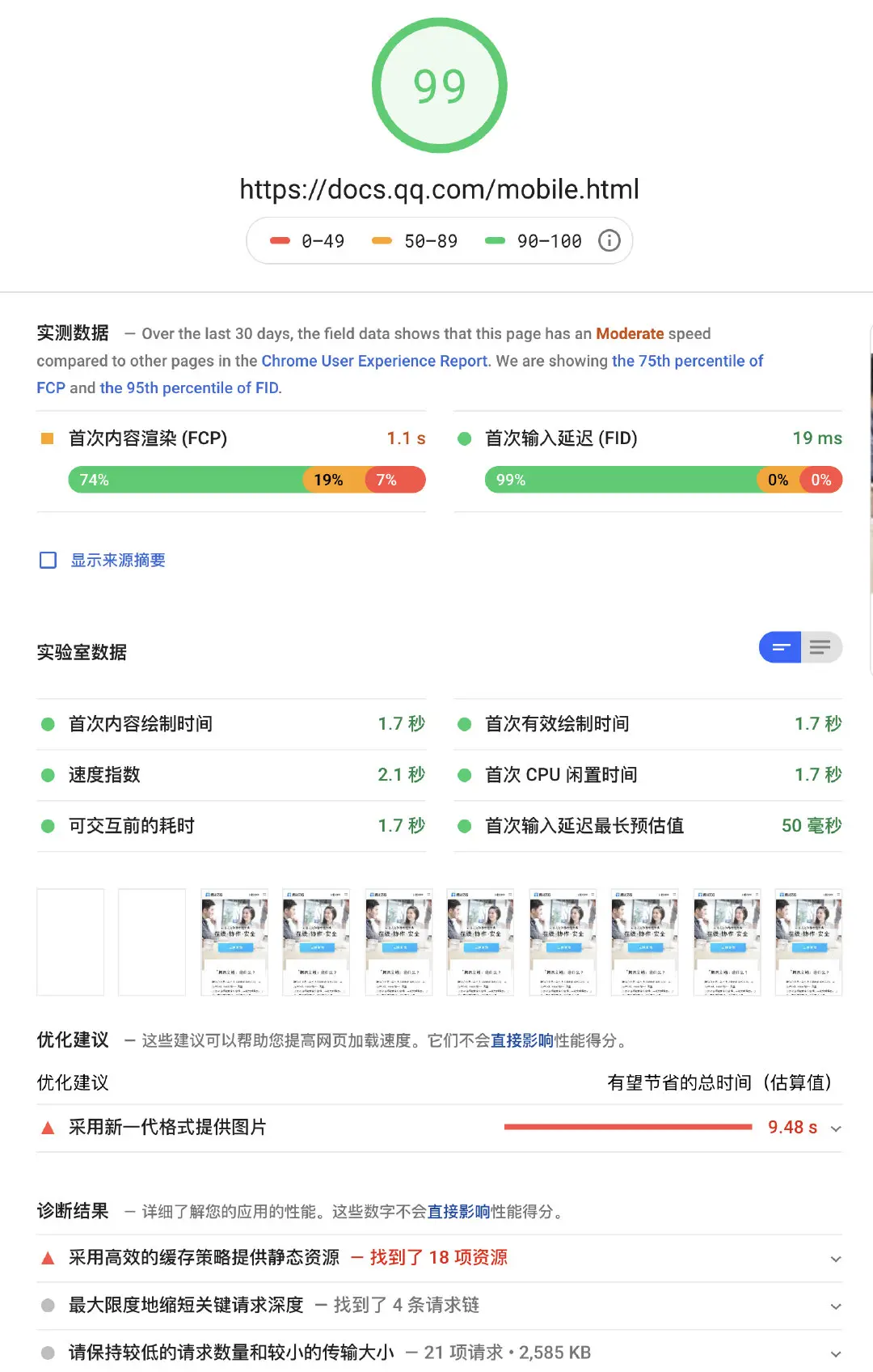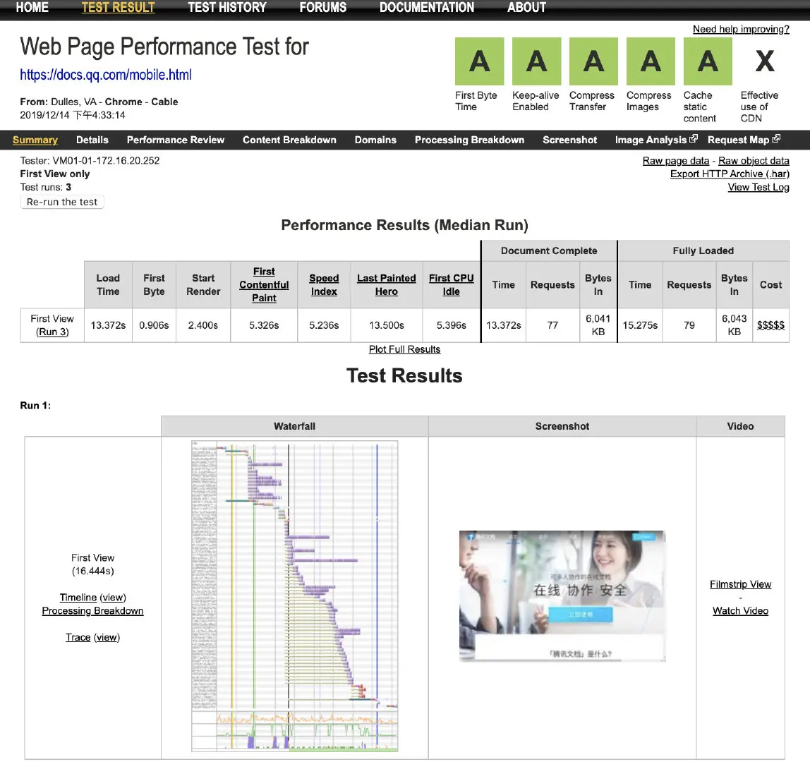 腾讯文档移动端首页测速结果和性能优化建议: