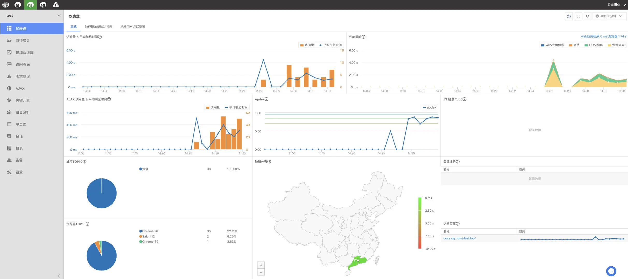功能包括:大盘数据、特征统计、慢加载追踪、访问页面、脚本错误、AJAX、组合分析、报表、告警等。