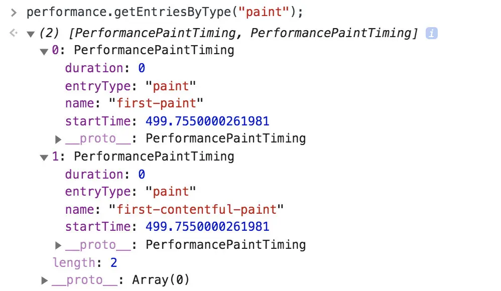 这两个指标浏览器已经标准化了,从 performance 的 The Paint Timing API 可以获取到,一般来说两个时间相同,但也有情况下两者不同。
