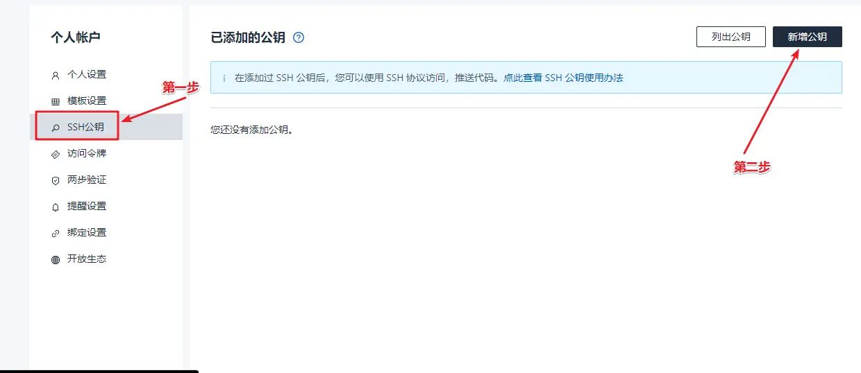 在个人设置里面,点击SSH公钥,点击新增公钥。