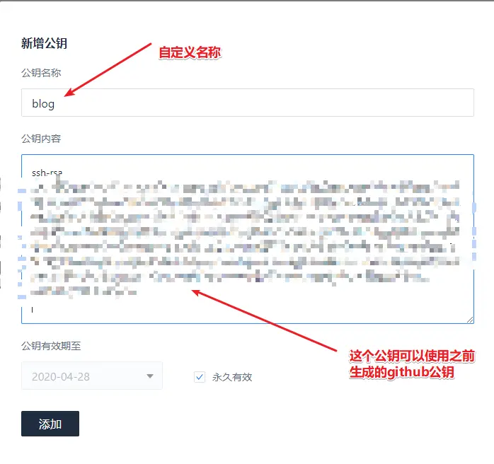 - 公钥内容:可以使用之前连接GitHub的公钥,在本地的