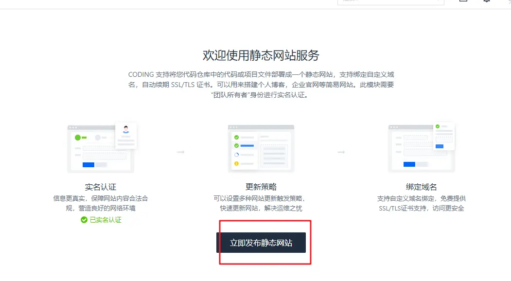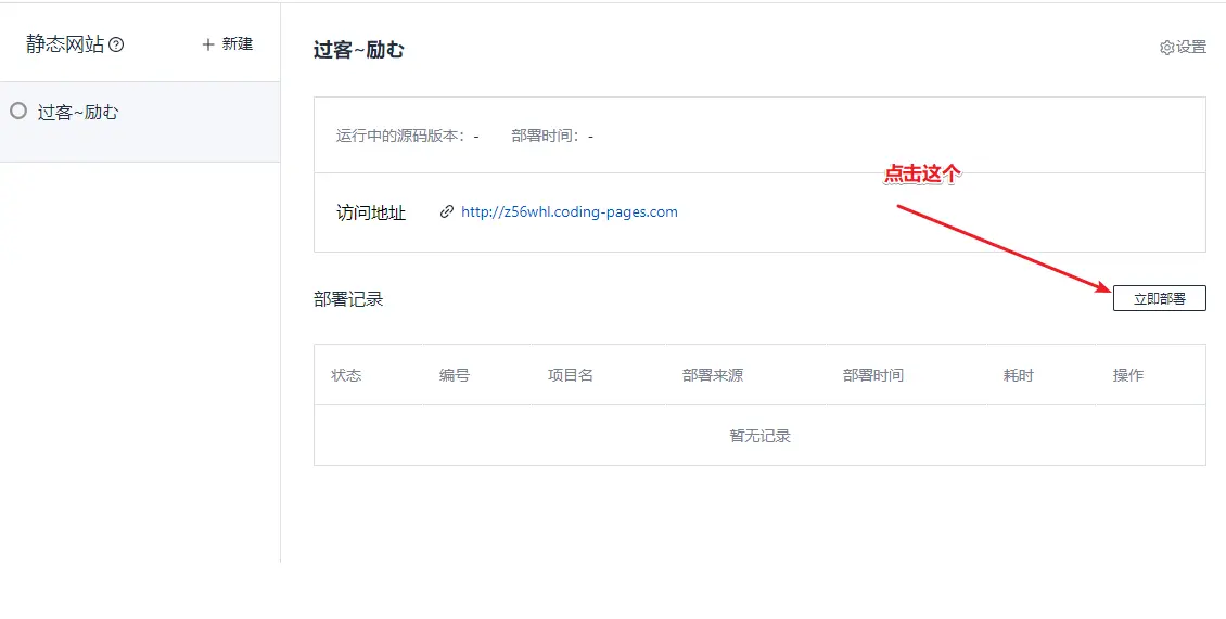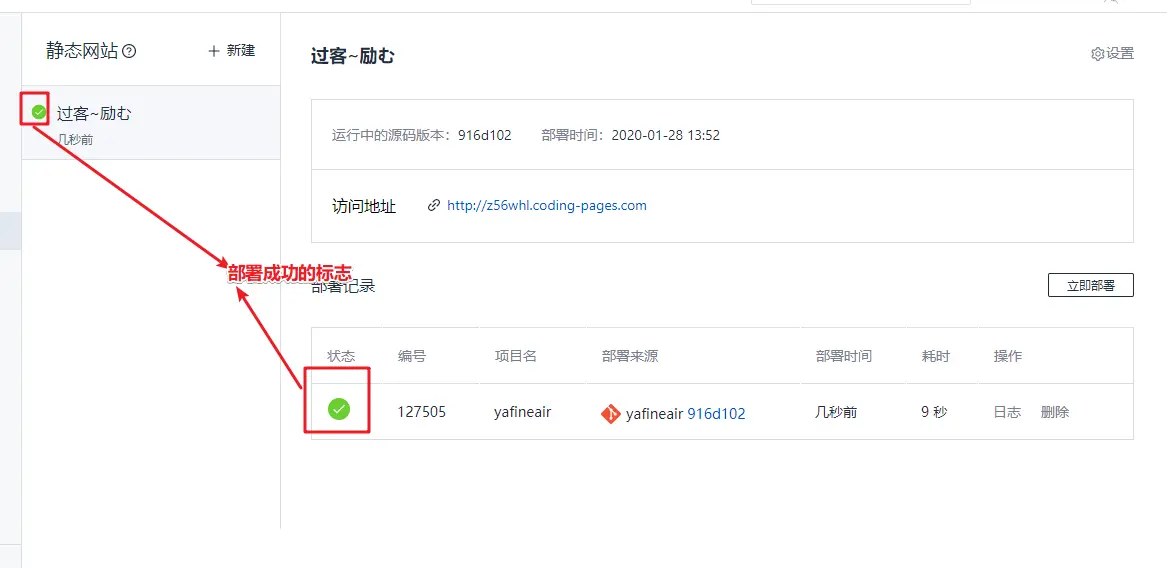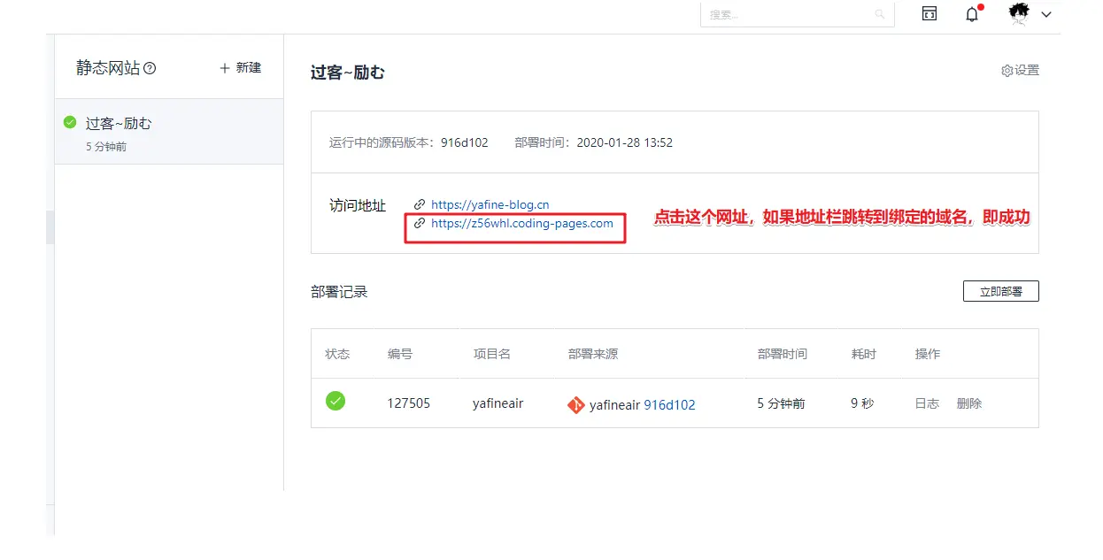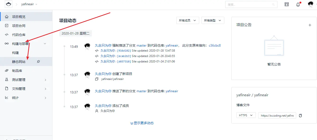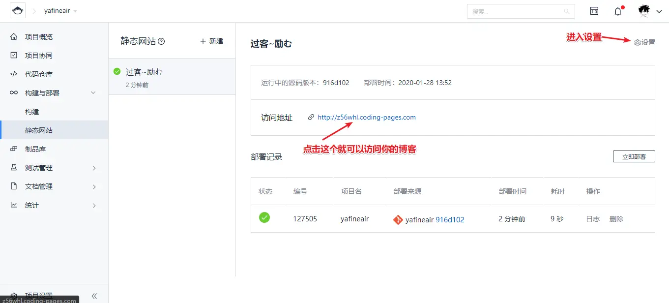 然后再执行hexo clean && hexo g -d部署到coding,紧接着,打开你的coding项目管理页,进行静态网站构建,页面如下,按图中步骤操作即可: